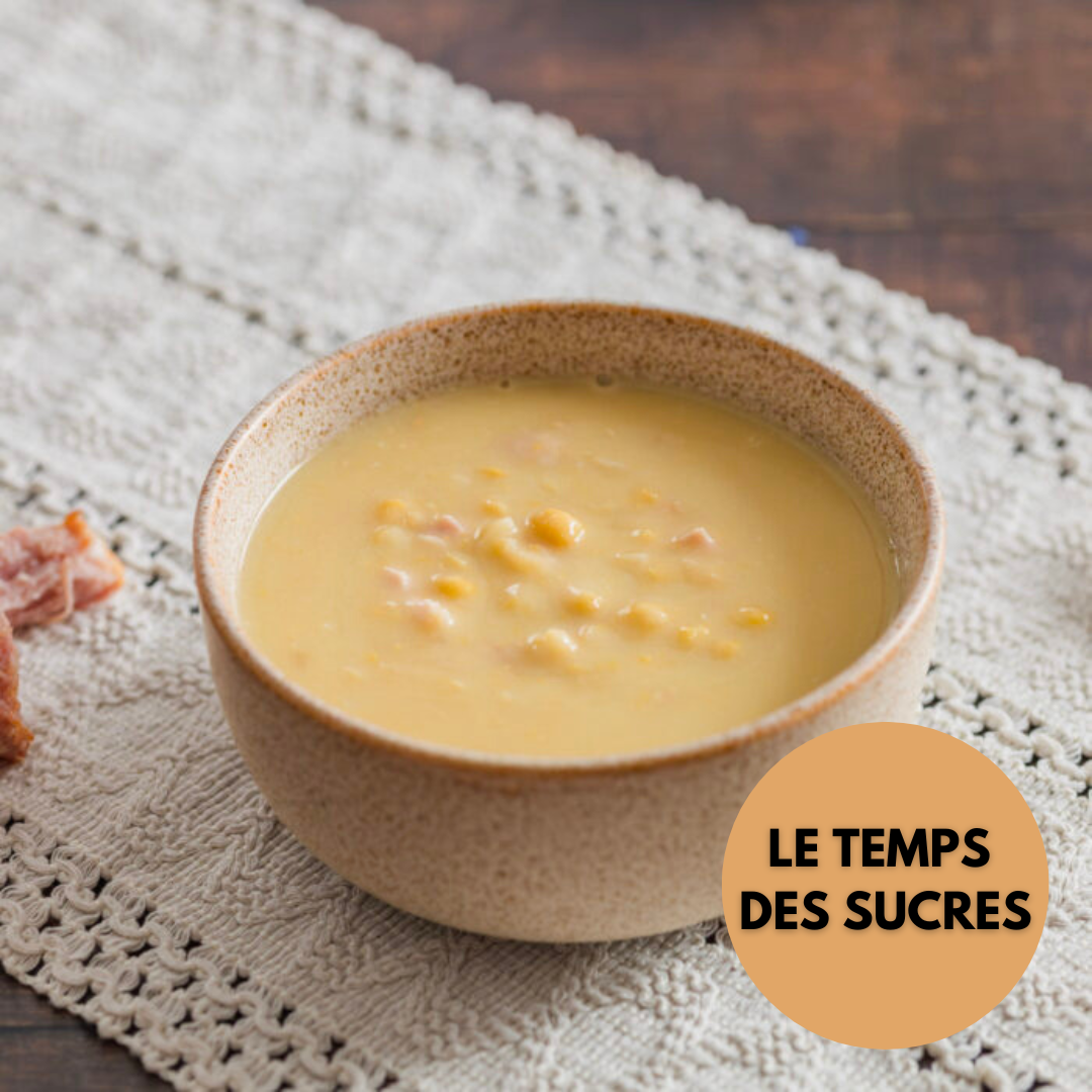 Ingrédients : pois jaunes secs, eau, flanc de porc salé, oignons, beurre, carottes, céleri, sirop d’érable, jambon effiloché, épices.