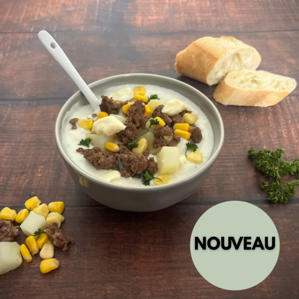 Ingrédients : Pommes de terre, boeuf haché, oignons, maïs en grains, bouillon de poulet, crème.