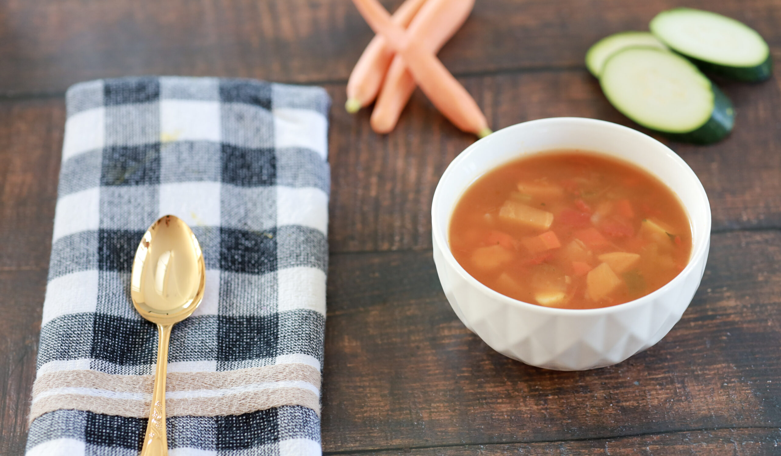 Ingrédients : Carottes, céleris, oignons, courgette, navet, pommes de terre, ail) tomates en dés, jus de tomate & bouillon de poulet.