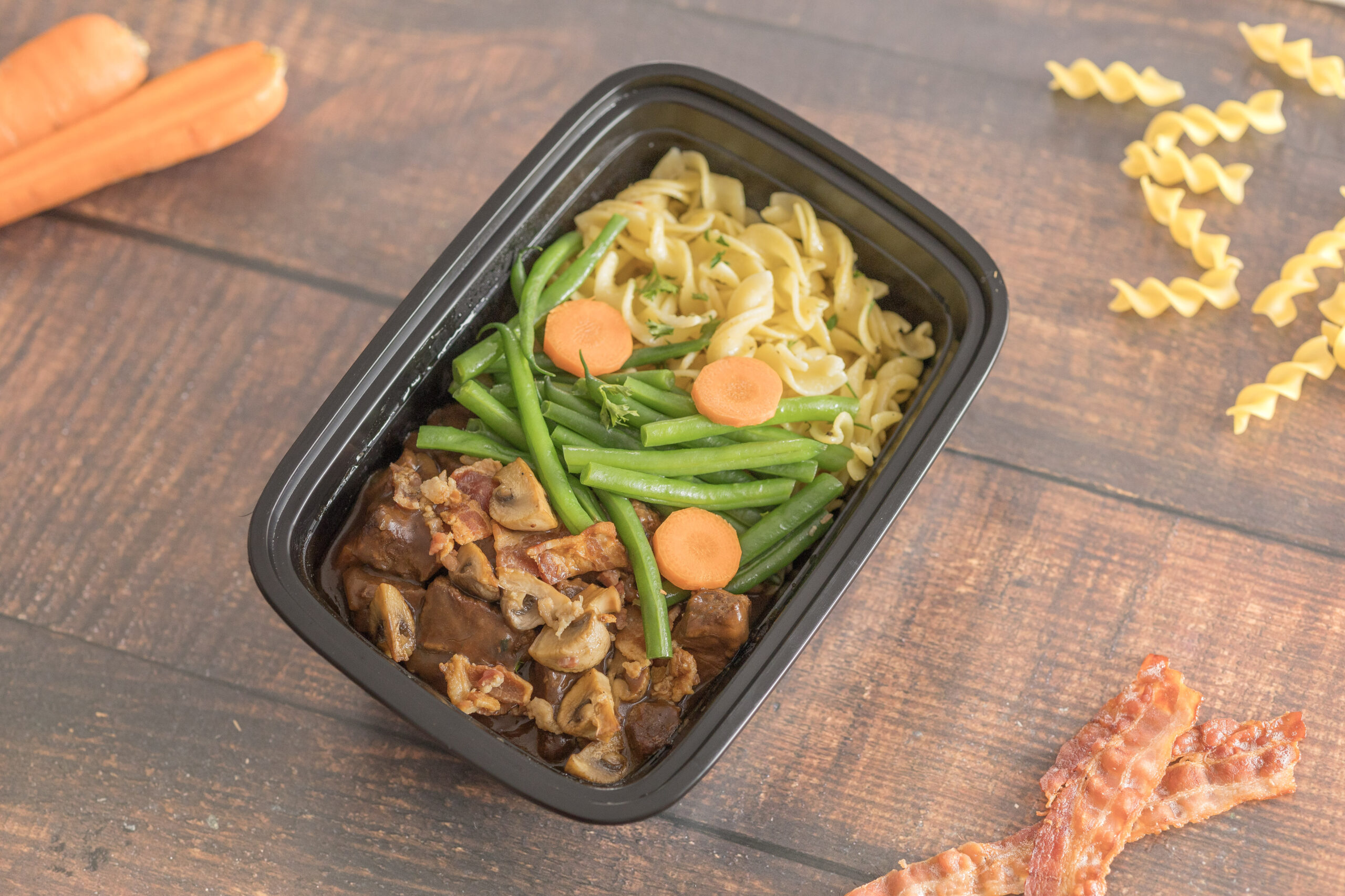 Ingrédients : cubes de boeuf, champignons, bacon, oignons, ail, beurre, farine, bouillon de boeuf, vin rouge, épices, nouilles aux oeufs, persil, ciboulette, huile, épices, légumes.