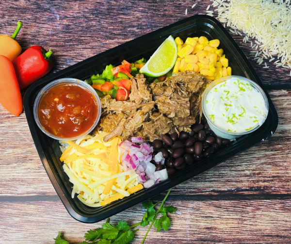 Ingrédients : Porc , épices. Riz basmati, salsa, fromage texmex, haricots noirs, maïs en grains, poivrons rouges, poivrons verts, oignons rouges, crème sûre, guacamole, lime, épices.