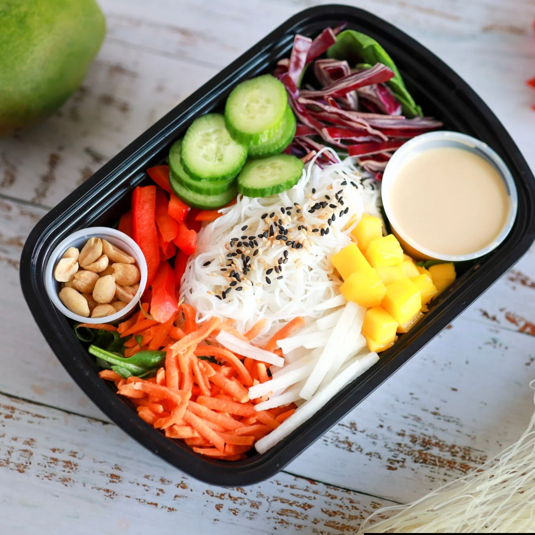 Ingrédients : Bébés épinards, vermicelles de riz, mangues, daïkon, carottes râpées, poivrons rouges, concombres, chou rouge, mélange croustillant d’arachides cajous & nouilles croustillantes, vinaigrette sauce Wafu & huile de sésame.