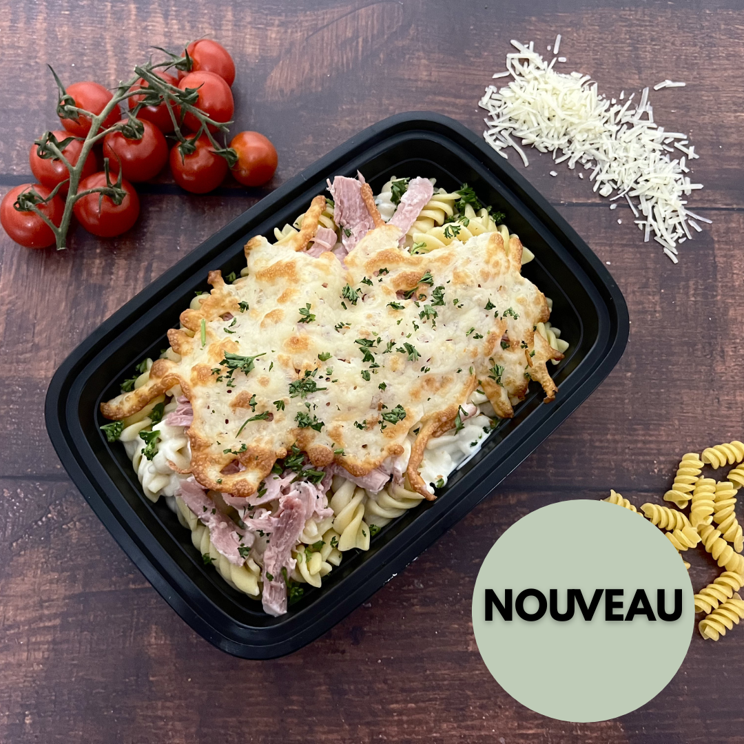 Ingrédients :Fusillis, lait, crème, beurre, farine, cheddar fort blanc, épices. Jambon effiloché, fromage mozzarella, chapelure panko, persil.