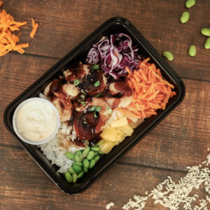 Sauté de porc haché à la façon d’un egg roll déconstruit ( porc haché, oignons, carottes, chou vert, châtaignes d’eau, sauce soya, cassonade, huile de sésame, épices chinoises) garni d’un filet de mayo au gingembre & oignons verts sur lit de riz au jasmin.