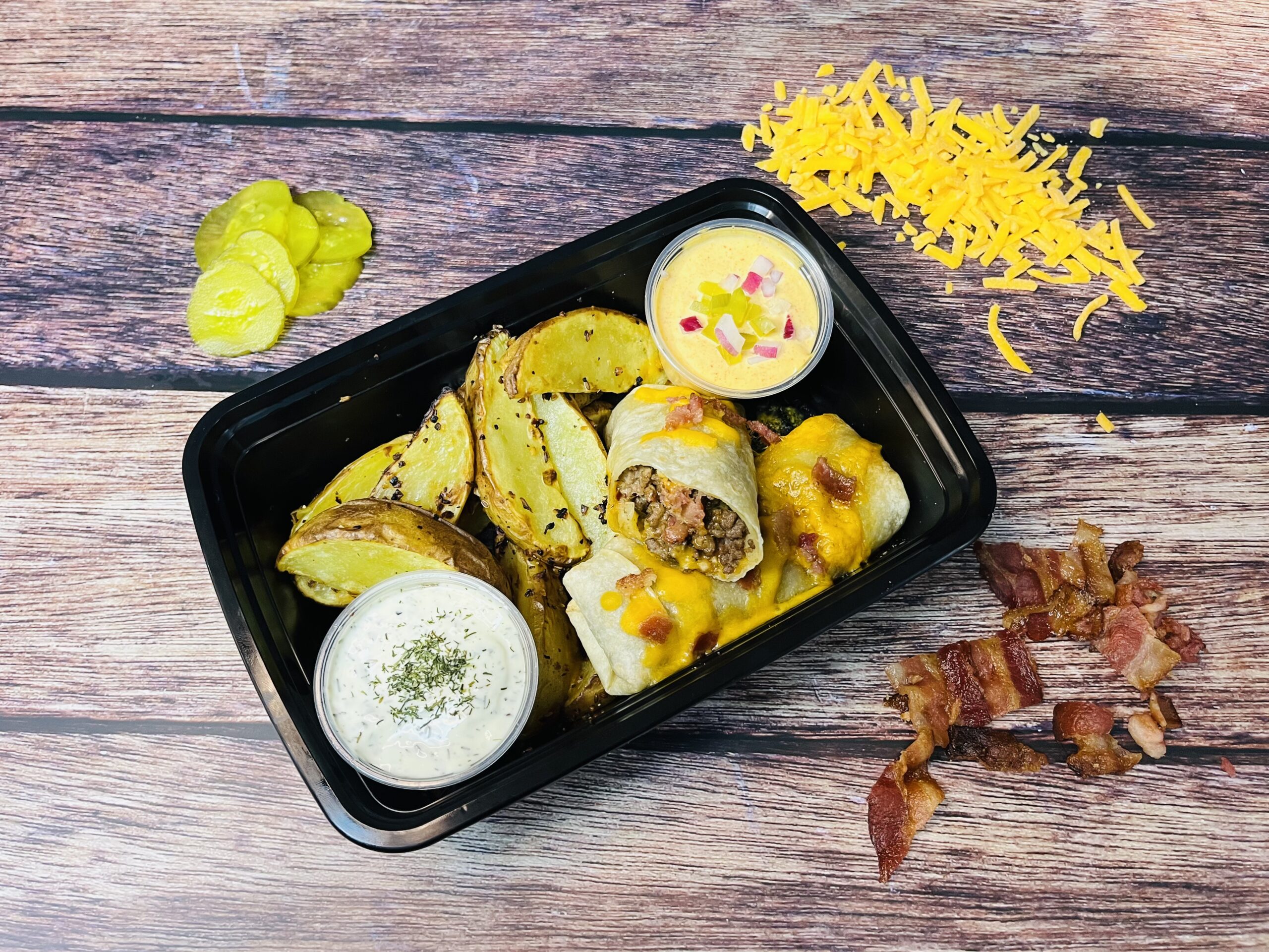 Ingrédients : Tortillas, boeuf & porc haché, oignons blancs, oignons rouges, cornichons, cheddar fort, bacon émietté, épices. Pommes de terre yukon golf, huile, épices, mayonnaise, moutarde jaune, vinaigrette française, relish, vinaigre, ketchup, sucre, épices, mayonnaise, yogourt grec, jus citron, cornichons, aneth frais, ail, épices.