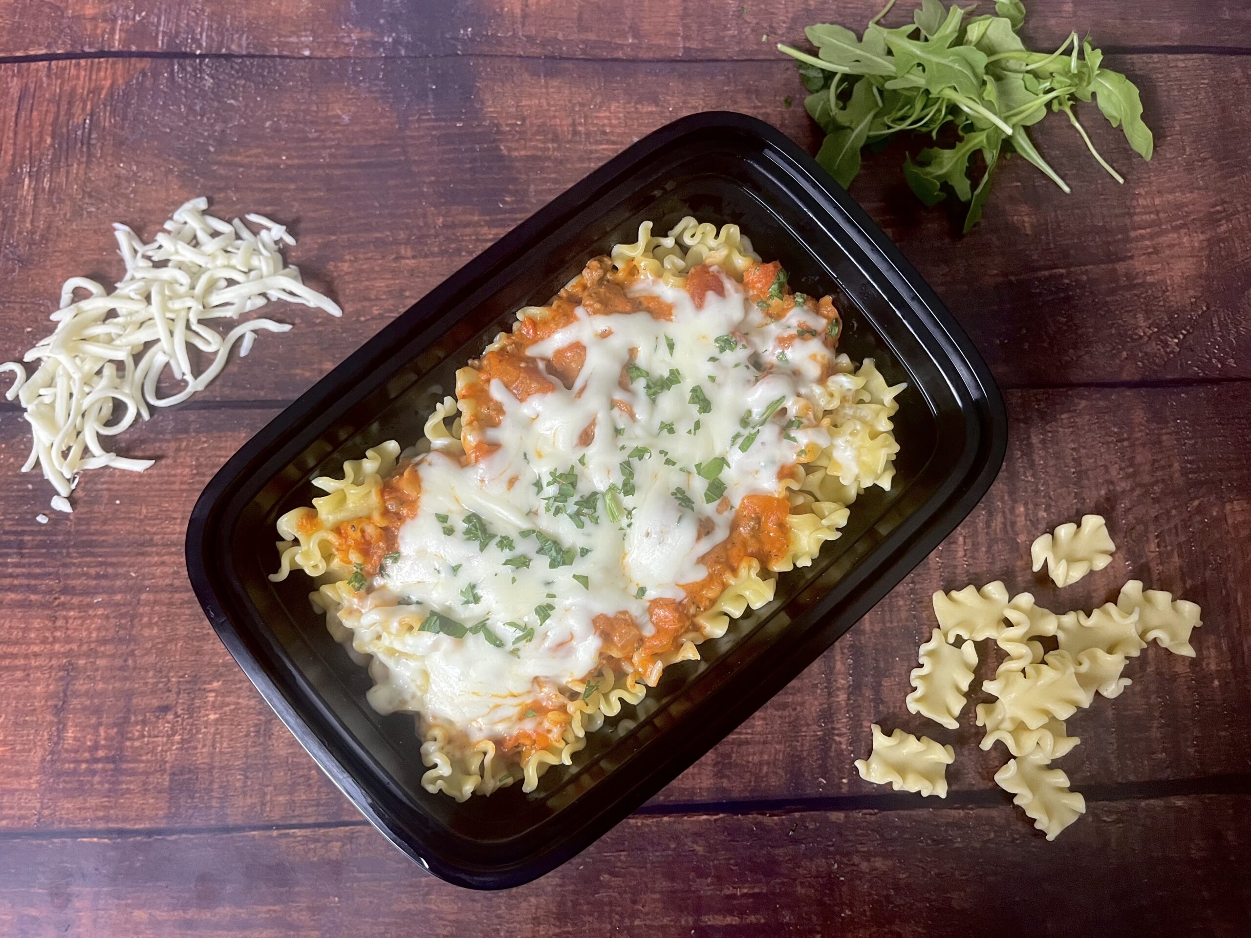 Ingrédients : Pâtes Mafalda, fromage mozzarella, fromage parmesan, persil frais, oignons, ail, céleris, carottes, pancetta, porc haché, boeuf haché, tomates en dés, sauce tomate, soupe tomate, lait, crème, beurre, farine, épices.
