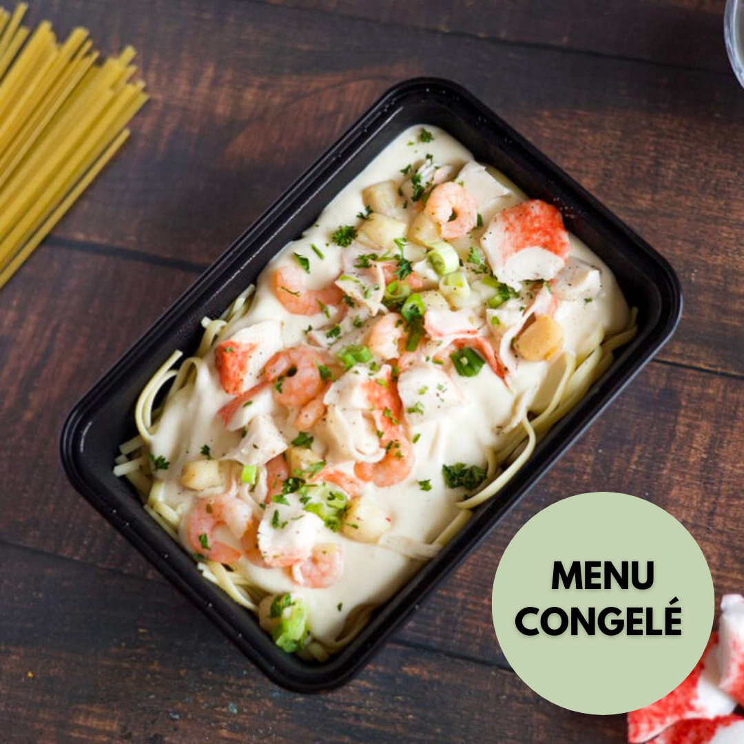 Linguinis nappés de sauce béchamel garnis généreusement de fruits de mer (crevettes, pétoncles & flocons de goberge) sautés à l’ail, oignons verts & vin blanc.
