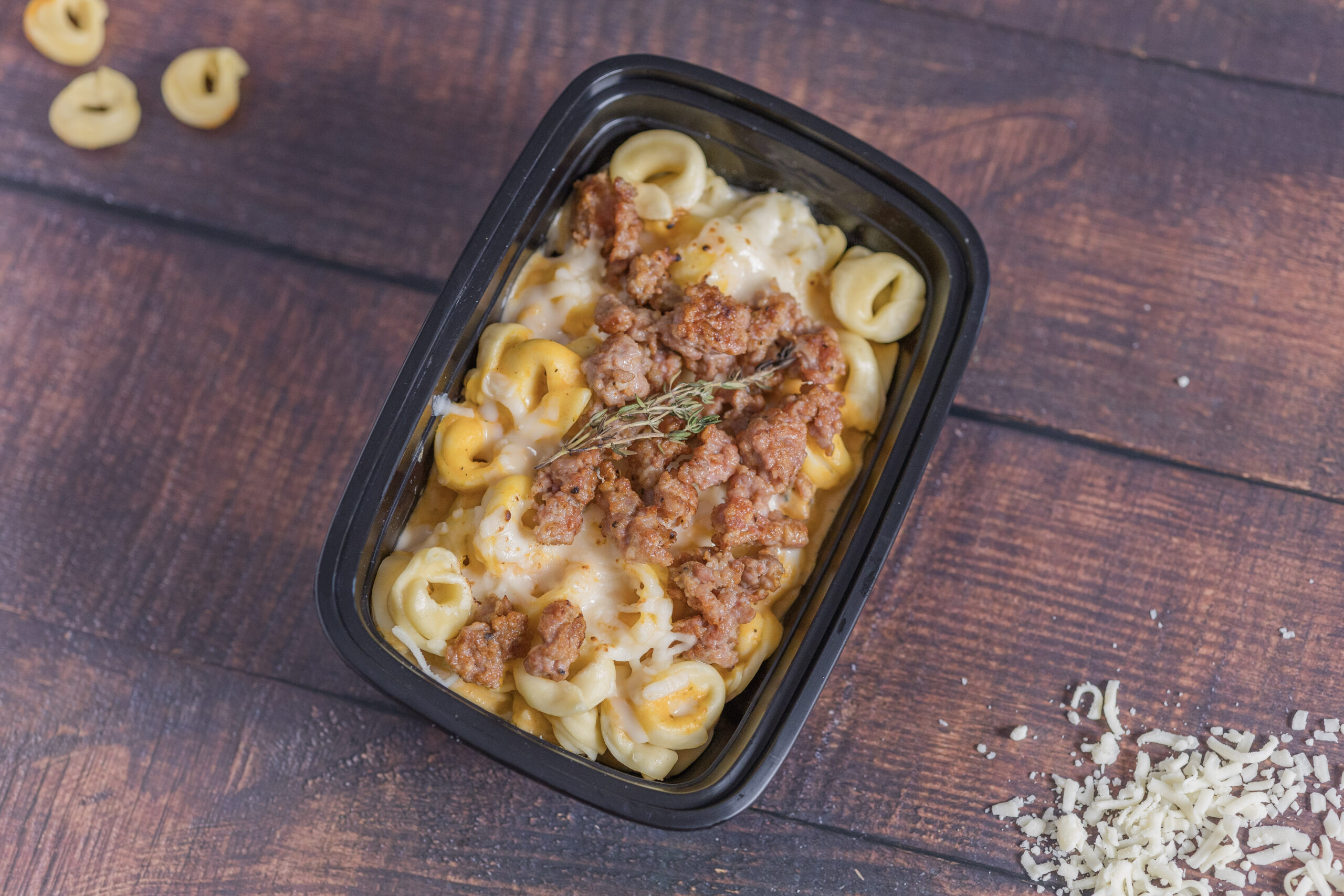 Ingrédients : Tortellinis au fromage, beurre, farine, lait, crème, vin blanc, parmesan, bouillon de poulet, courge musquée, oignons, épices, chair de saucisse, cheddar fort, persil.