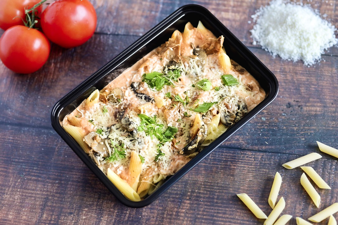 Pennes dans une sauce rosée flambée à la vodka avec ail & pancetta, garnis de prosciutto, champignons sautés, oignons verts & fromage parmesan